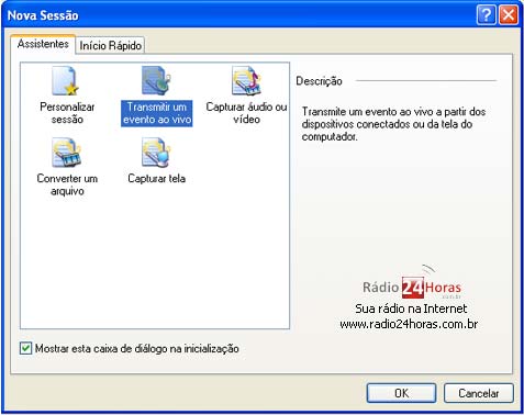1- Abra o Windows Media Encoder e clique na opção "Transmitir um evento ao vivo" (v. inglês: Broadcast a live event), depois clique em "OK":