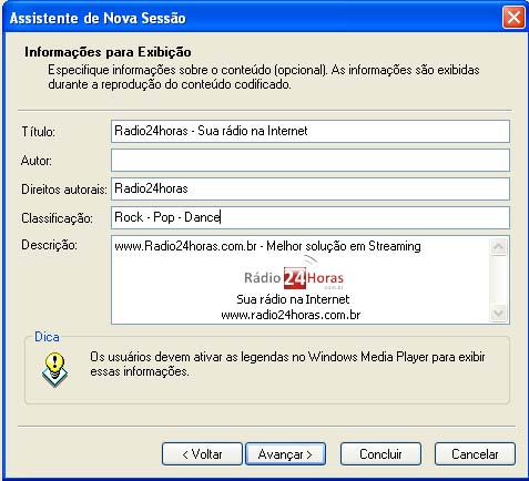 7- Coloque os dados que aparecerão na sua transmissão. Depois clique em "Avançar" ou "Concluir".