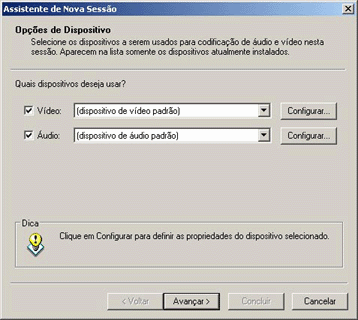2-. Selecione o dispositivo em Opções de   Dispositivo, que será usado para a transmissão. Selecione tanto o Vídeo   como o Áudio, com o dipositivo correto e clique em "Avançar".