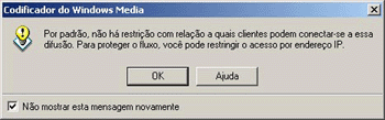10- Agora poderá aparecer uma mensagem de que "não foi possível detectar o tipo de ponto de publicação". Apenas clique em <OK>, e ainda, selecione a opção "Não mostra esta mensagem novamente".Seguirá um aviso do Codificador. Marque para que não mostre mais esta mensagem e <OK>:
